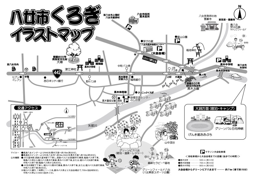 乗換案内の到着地を八女市黒木体育センターにしていただくとご自身の最寄駅から乗り換え検索できます。